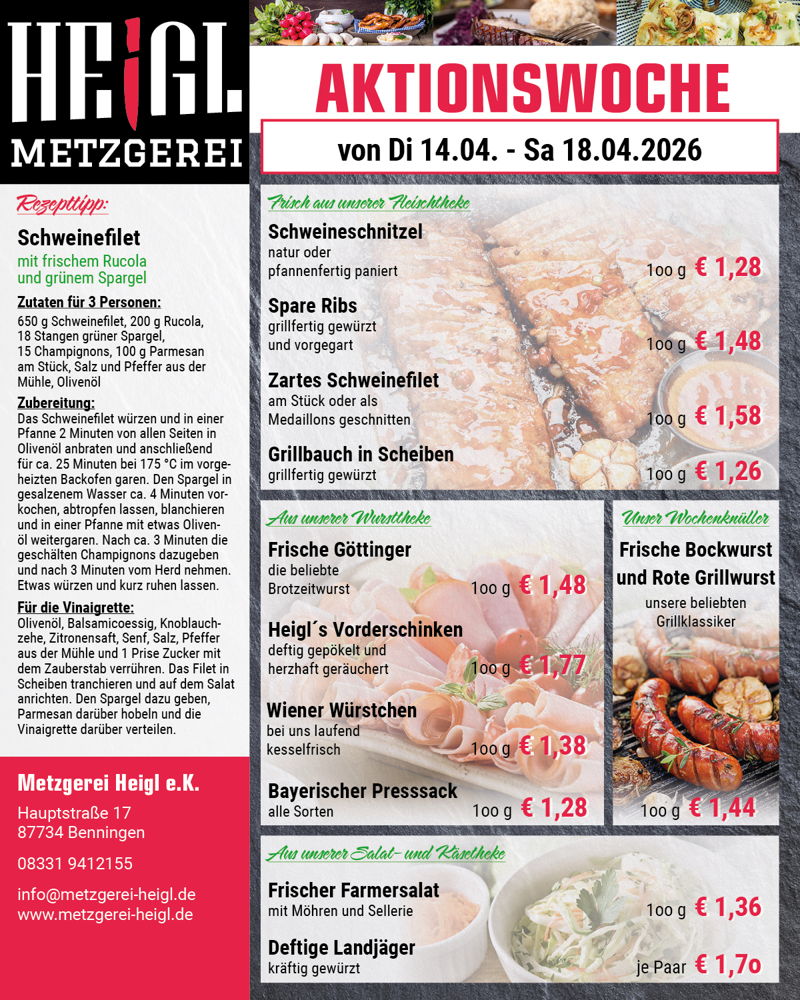 Wir bei Heigl haben unser traditionsreiches Handwerk gelernt. Mit Leidenschaft und Erfahrung arbeiten wir jeden Tag für beste und frischeste Produkte für qualitätsbewusste Menschen wie dich. Unsere hochwertigen Produkte vertreiben wir in unserer Metzgerei in Benningen, über unseren Metzgerei Online-Shop, unseren Lieferservice, in Kühlautomaten und auf dem Wochenmarkt in Memmingen. Und wenn du eine Feier planst und keinen Bock hast, selbst zu kochen, sind wir dein Catering-Service im Allgäu.